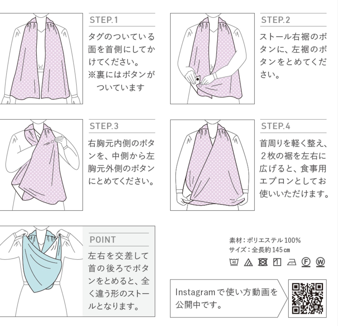 ボタンの留め方で表情が変わり、お出かけのときはストールとして、食事のときにはエレガントなエプロンとして活躍します。