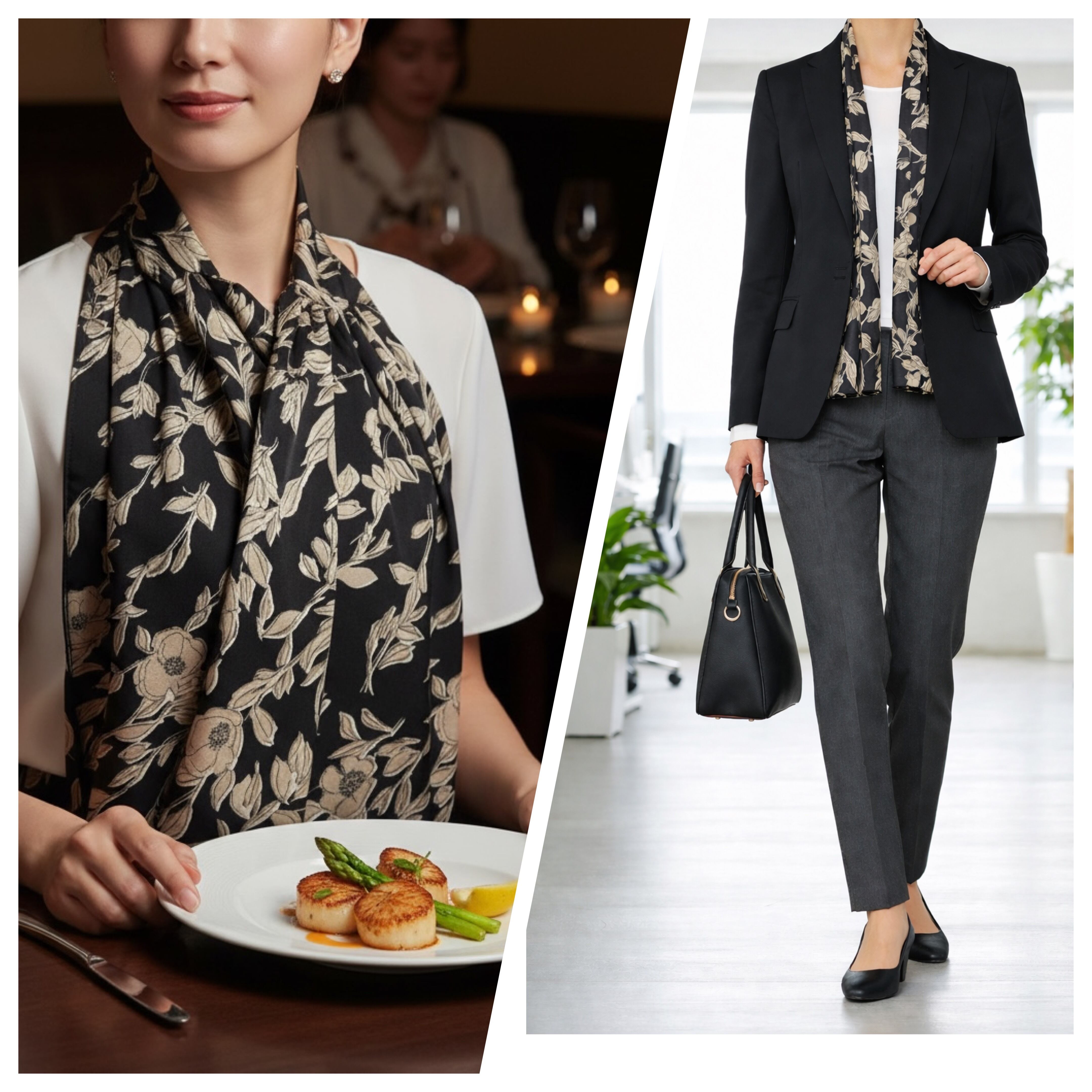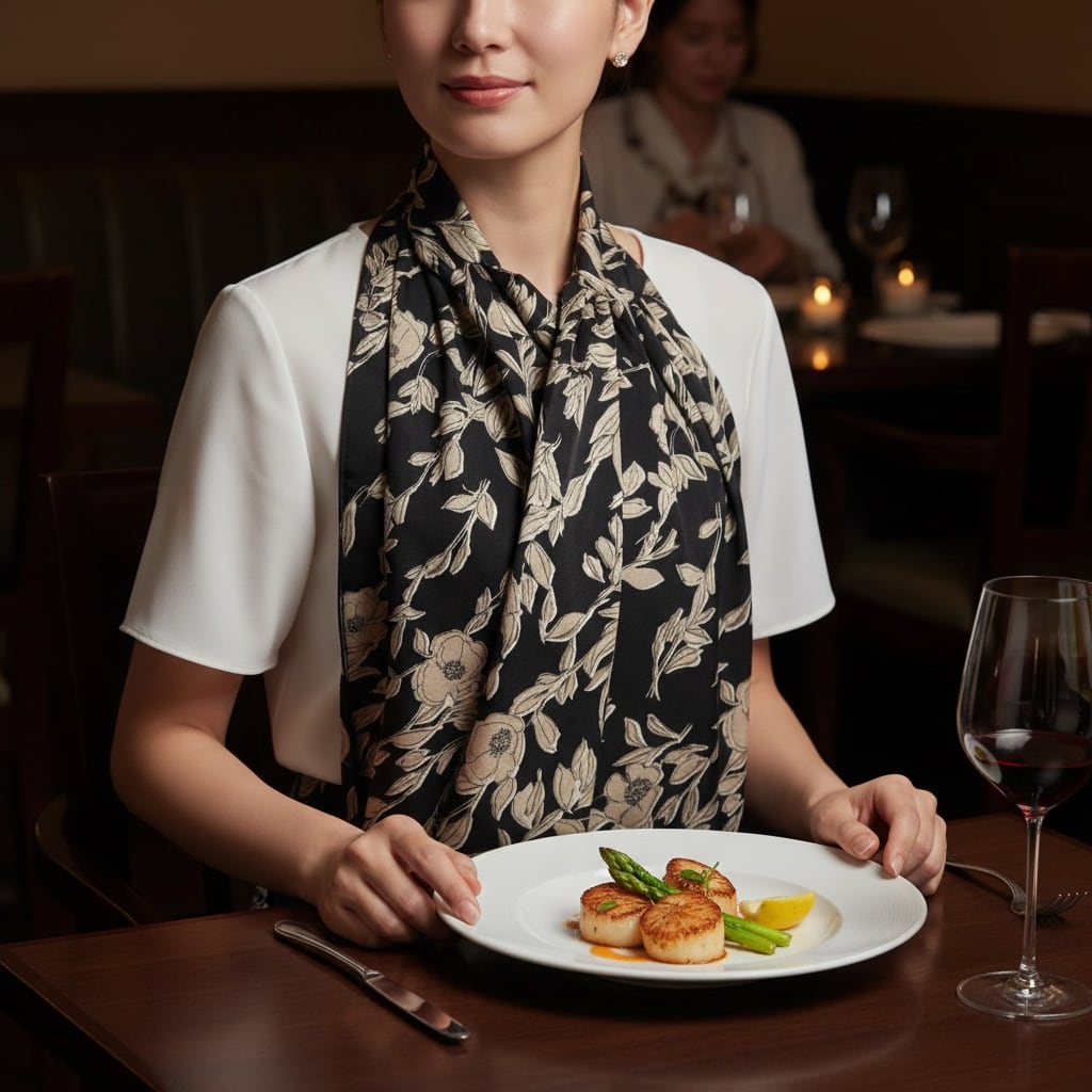 装いにそっと安心感を添える、外食時の汚れを防ぐ大人のためのエプロンストール。