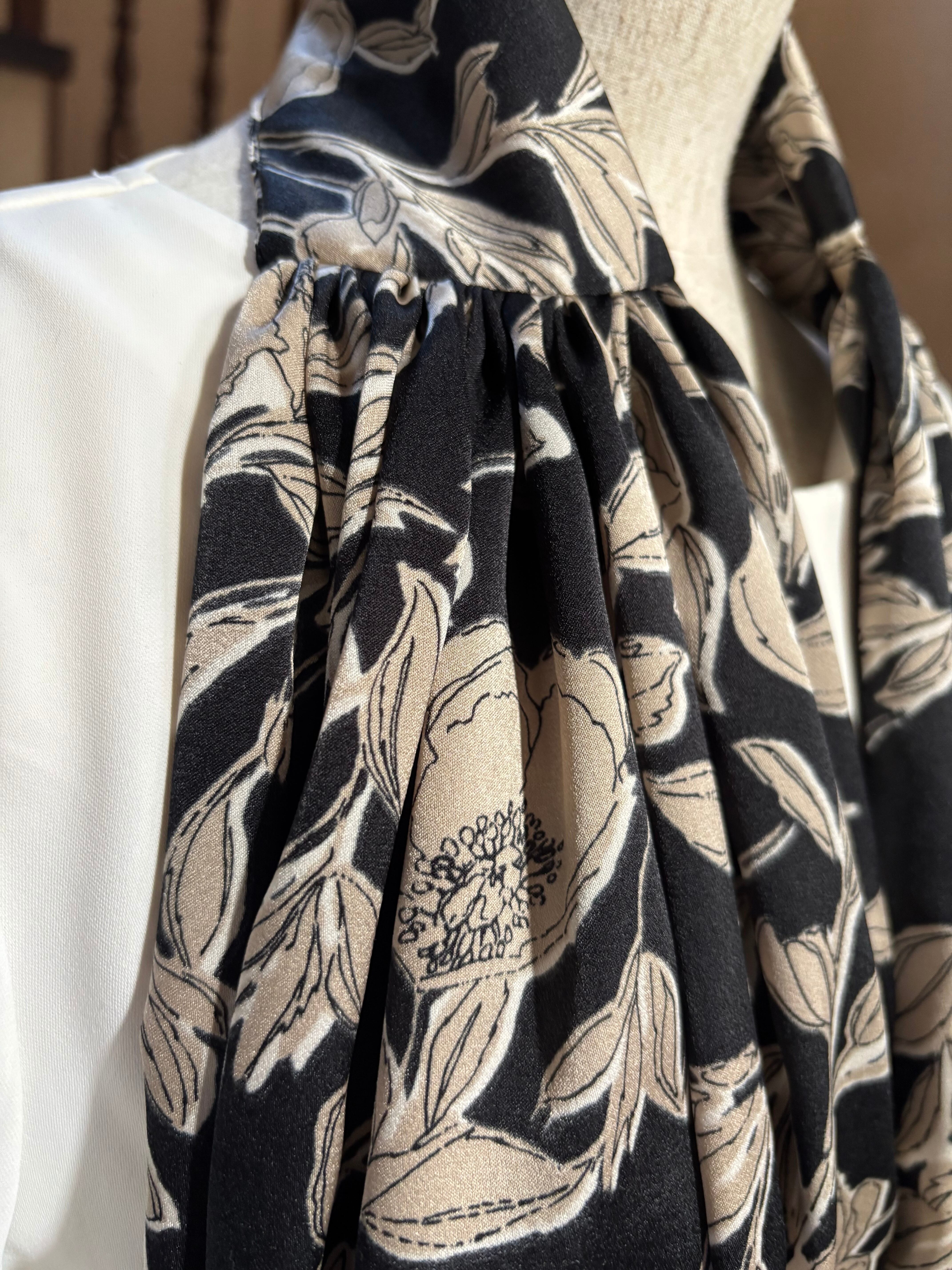 ボタンの留め方で表情が変わり、お出かけのときはストールとして、食事のときにはエレガントなエプロンとして活躍します。