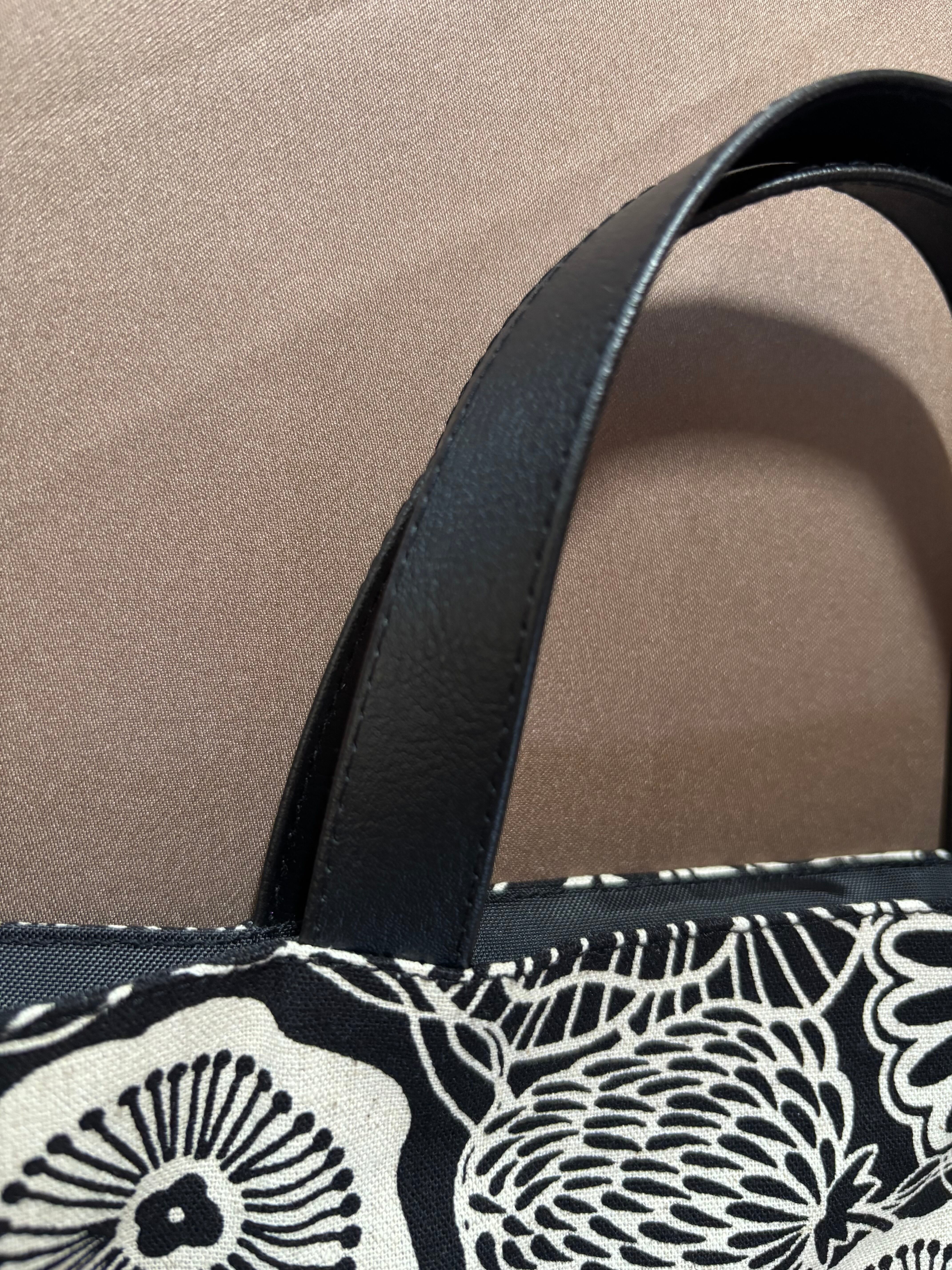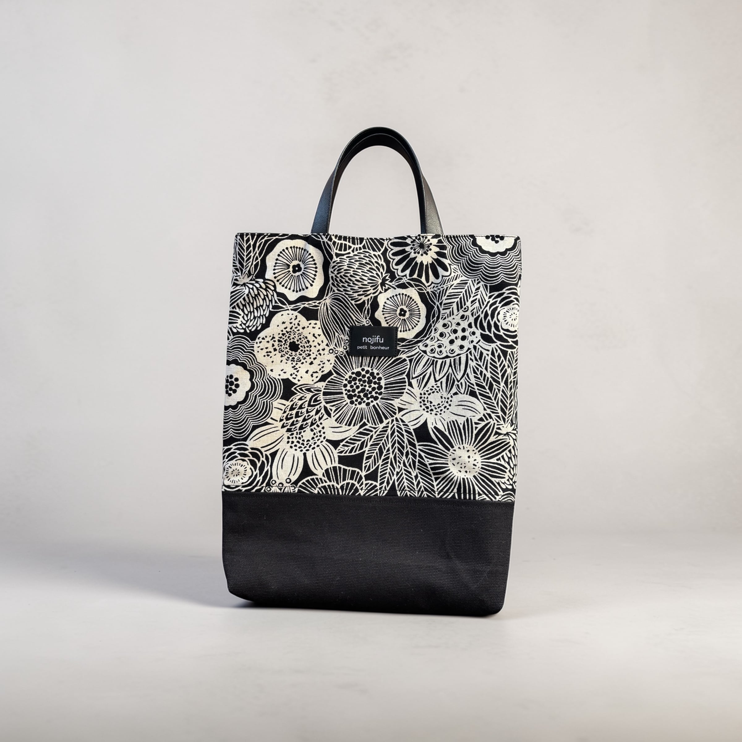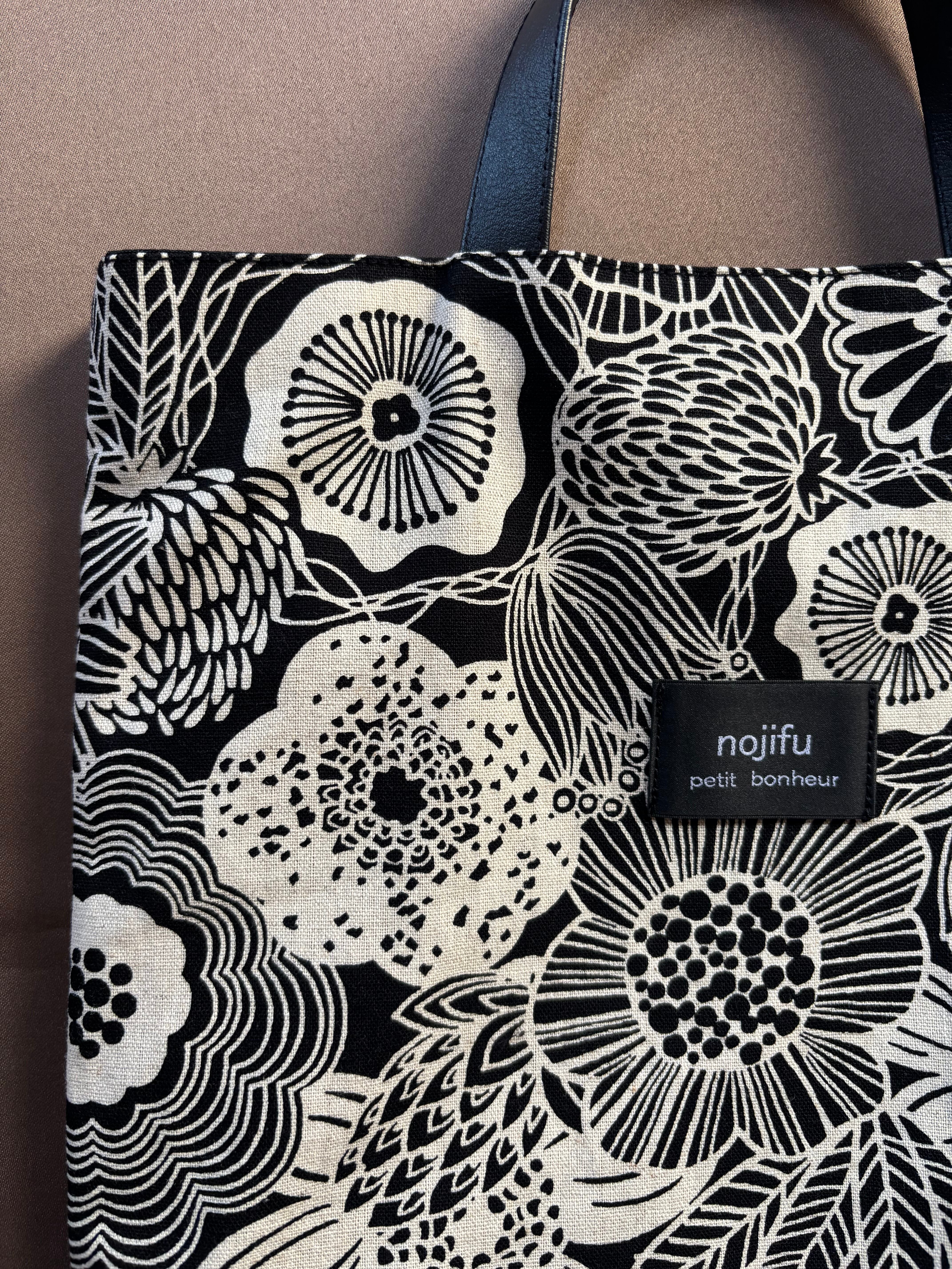 モノトーンのコットンリネン生地と黒の帆布を組み合わせた、持ち手の合皮が大人っぽいシンプルトートバッグです。